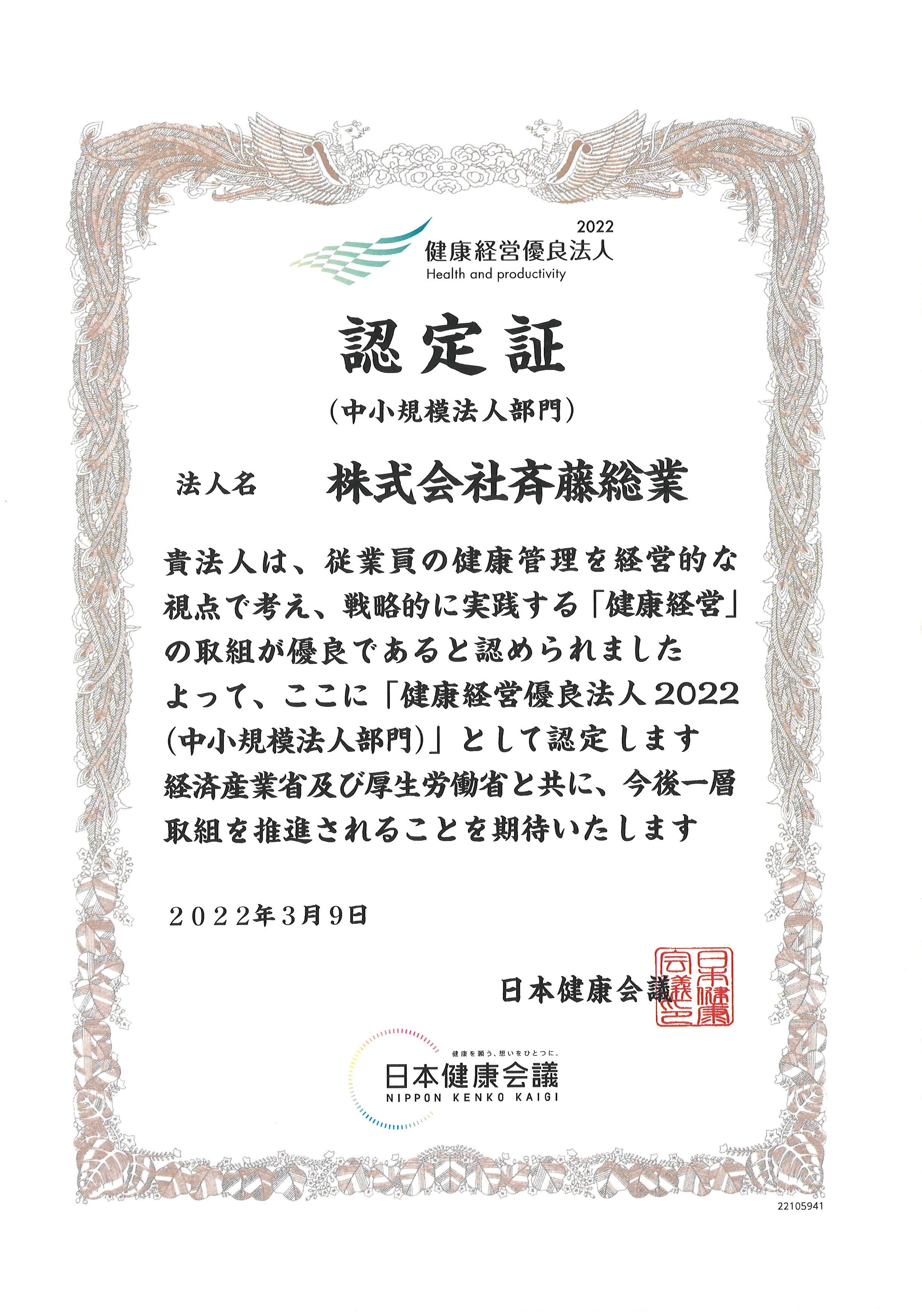 2022.03.09 健康経営優良法人2022(中小規模法人部門)に認定されました。 3月9日、経済産業省と日本健康会議が共同で選定する『健康経営優良法人2022(中小規模法人部門)』に3年連続で認定されました。 今後も全従業員の健康増進に向けて、さらなる取り組みの強化を図っていきます。