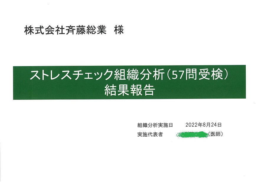 2022.08.25 2022年度ストレスチェック組織分析結果 ストレスチェック組織分析(57問受検)結果報告書が届きました。 今年も高ストレス者はいませんでした。 引き続き、メンタル不調を未然に防げるよう 職場環境の改善を進めてまいります。