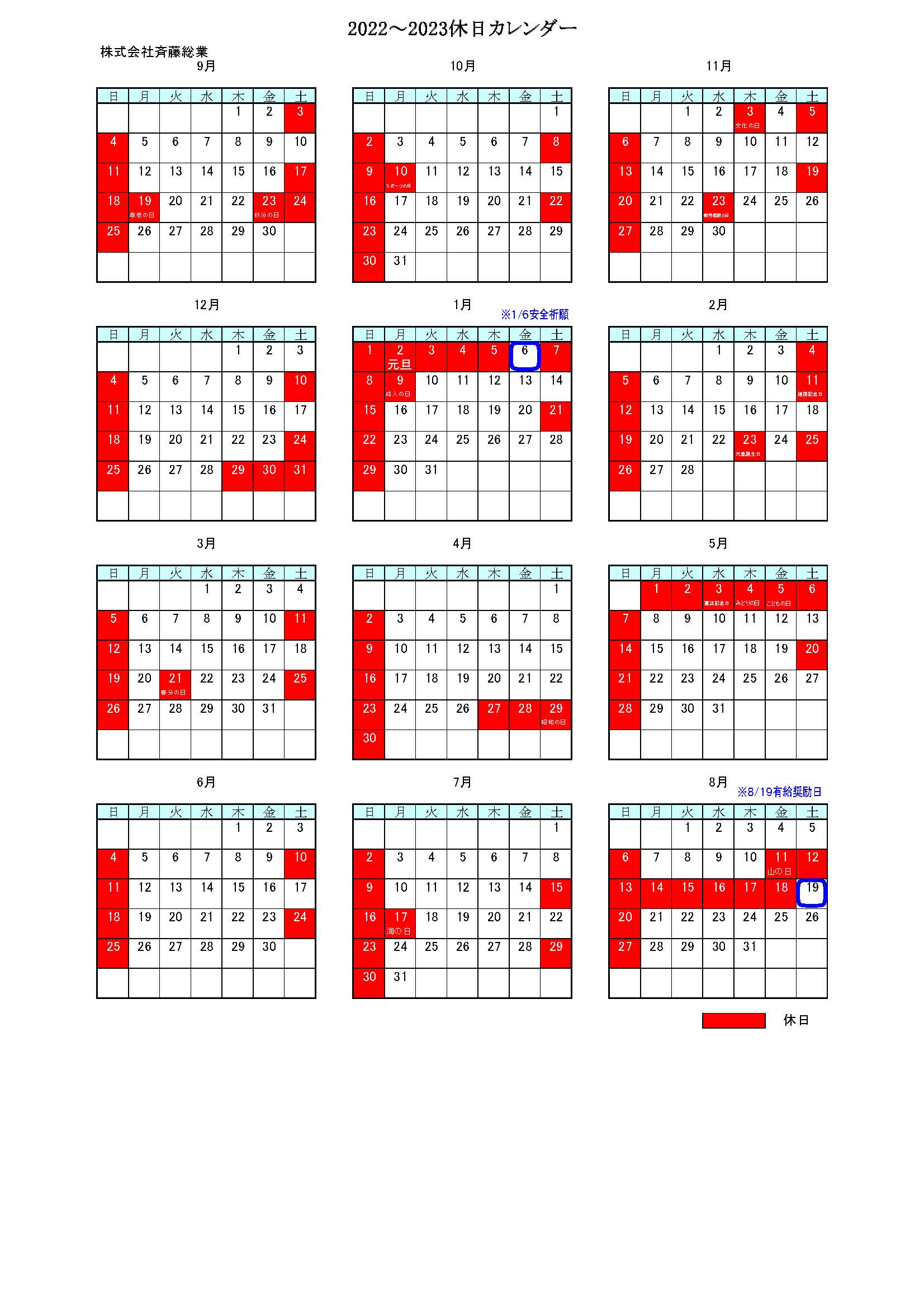 2022.09.01 年間休日カレンダー 2022年9月1日~2023年8月31日までの休日カレンダーを配布しました。 斉藤総業では、やる時はやる!休む時は休む!をモットーに 毎年年間休日カレンダーを作成しています。 連休になるように休日カレンダーを作成することで、 個人の予定や、有給休暇の予定も立てやすいです。 斉藤総業はこれからも働きやすい環境を目指していきます!