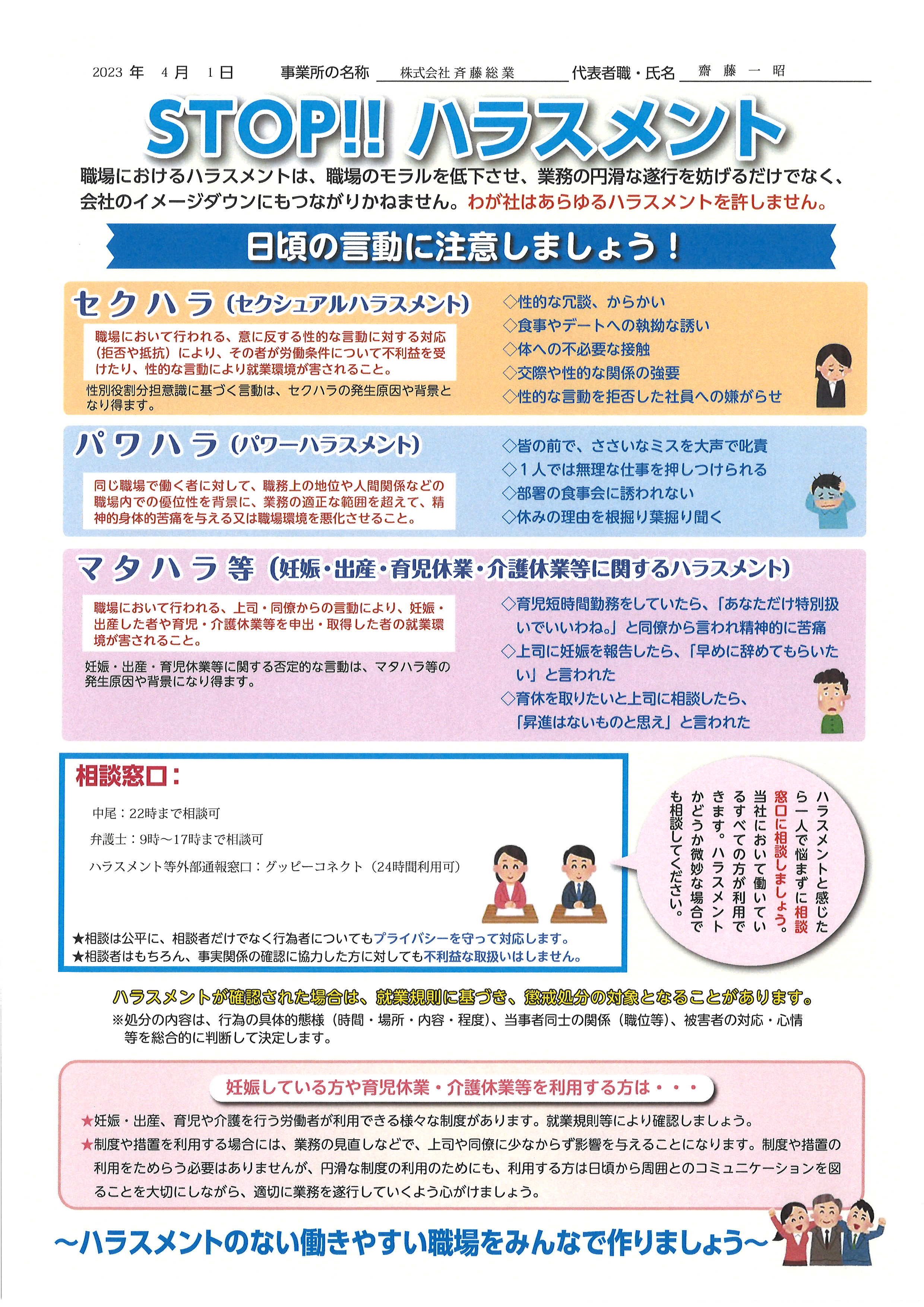 2023.04.01 ハラスメントのe-ラーニングを受けました。 ハラスメントのない快適な職場作りのためにe-ラーニングを 全員受けました。 期間 4月1日~4月16日まで ハラスメントについて学び、考える そして、風通しの良い、快適な職場づくりを目指しています。