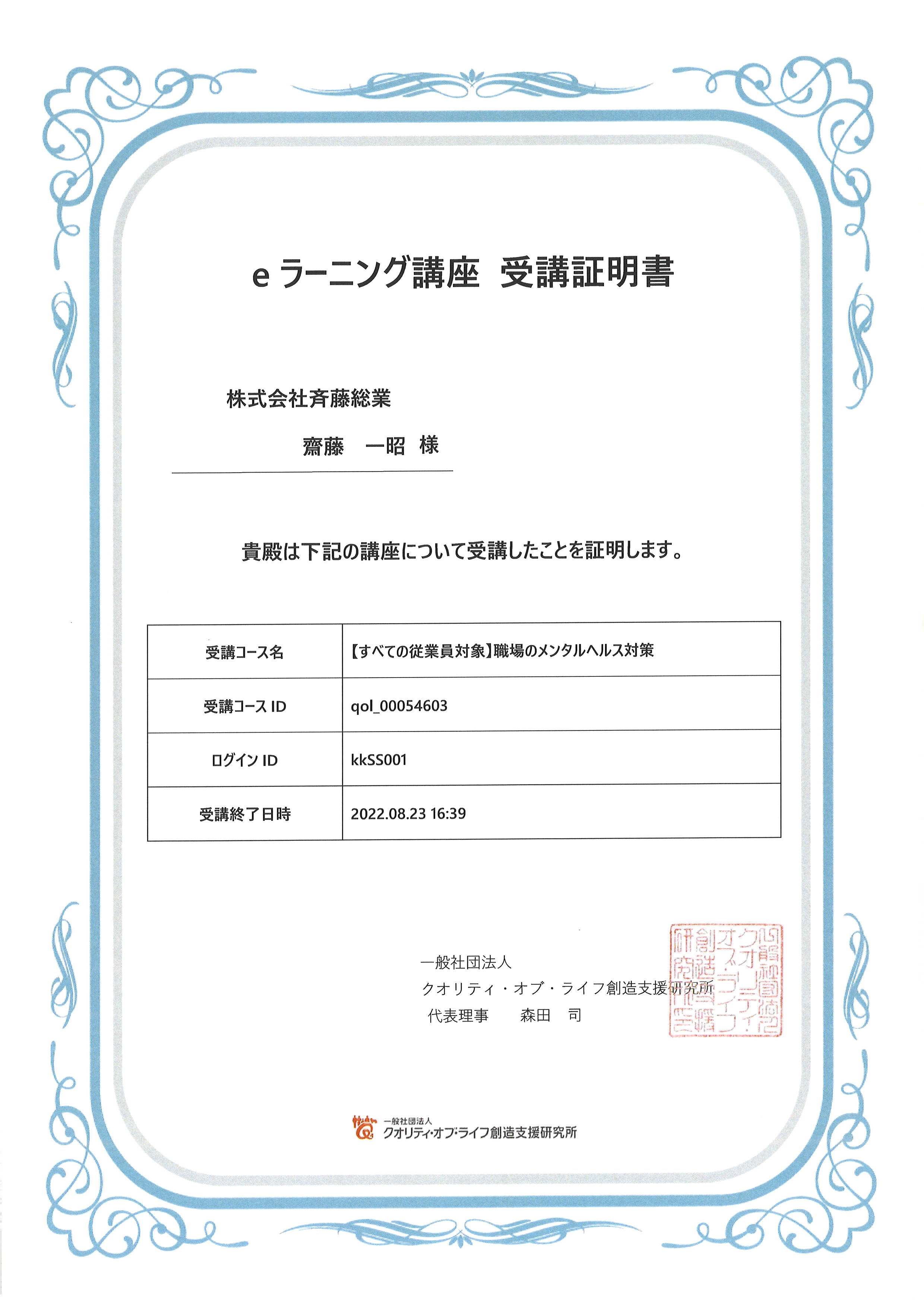 2022.10.03 Eラーニング受講しました。 期間 8月1日~9月30日 対象 全員 それぞれ時間のある時に、E-ラーニングの受講をしました。 ●職場のメンタルヘルス対策 ●職場のハラスメント対策 ●職職場のホスピタリティ研修 ●職場のコミュニケーション研修 ●職場のホスピタリティ研修 ●女性健康セミナー ●タバコと健康セミナー 最後にテストがあるので、理解できているのか振り返りがて良かったです! 受講者全員に受講証明書をいただきました。 証明書をいただけるって嬉しいものです