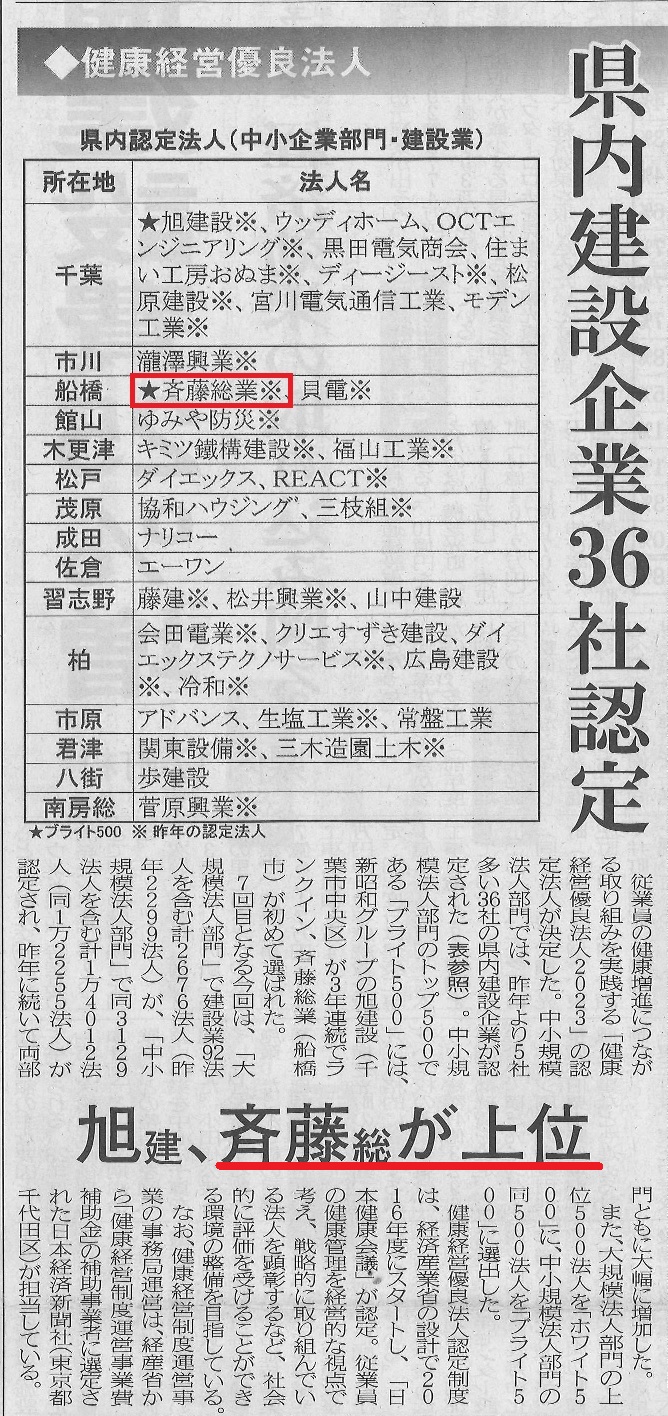 2023.03.14 日刊建設新聞に掲載されました。 3月14日の日刊建設新聞に県内の建設企業が健康経営の認定をうけた記事が掲載されました。 千葉県の建設業で健康経営の認定をうけた企業数は36社 そのうち、『ブライト500』の認定をうけたのは2社でした。 船橋市では初のブライト500の認定となりました。 これからも、社員の心と身体の健康維持・増進、働きやすい環境づくりのために、新たな取り組みを積極的に取り入れてまいります。