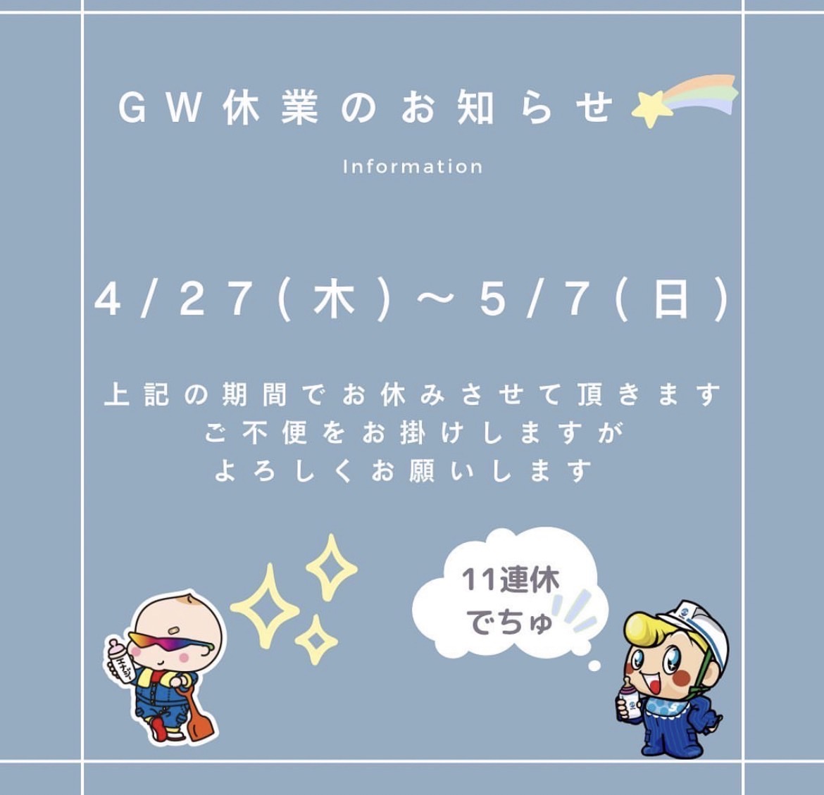 2023.04.27 ゴールデンウィーク休業のお知らせ 2023年4月27日(木)~5月7日(日)まで 上記の期間休業とさせていただきます。 ご不便をお掛けしますが、何卒ご了承の程お願い申し上げます。 5月8日(月)より平常通りの営業となります。