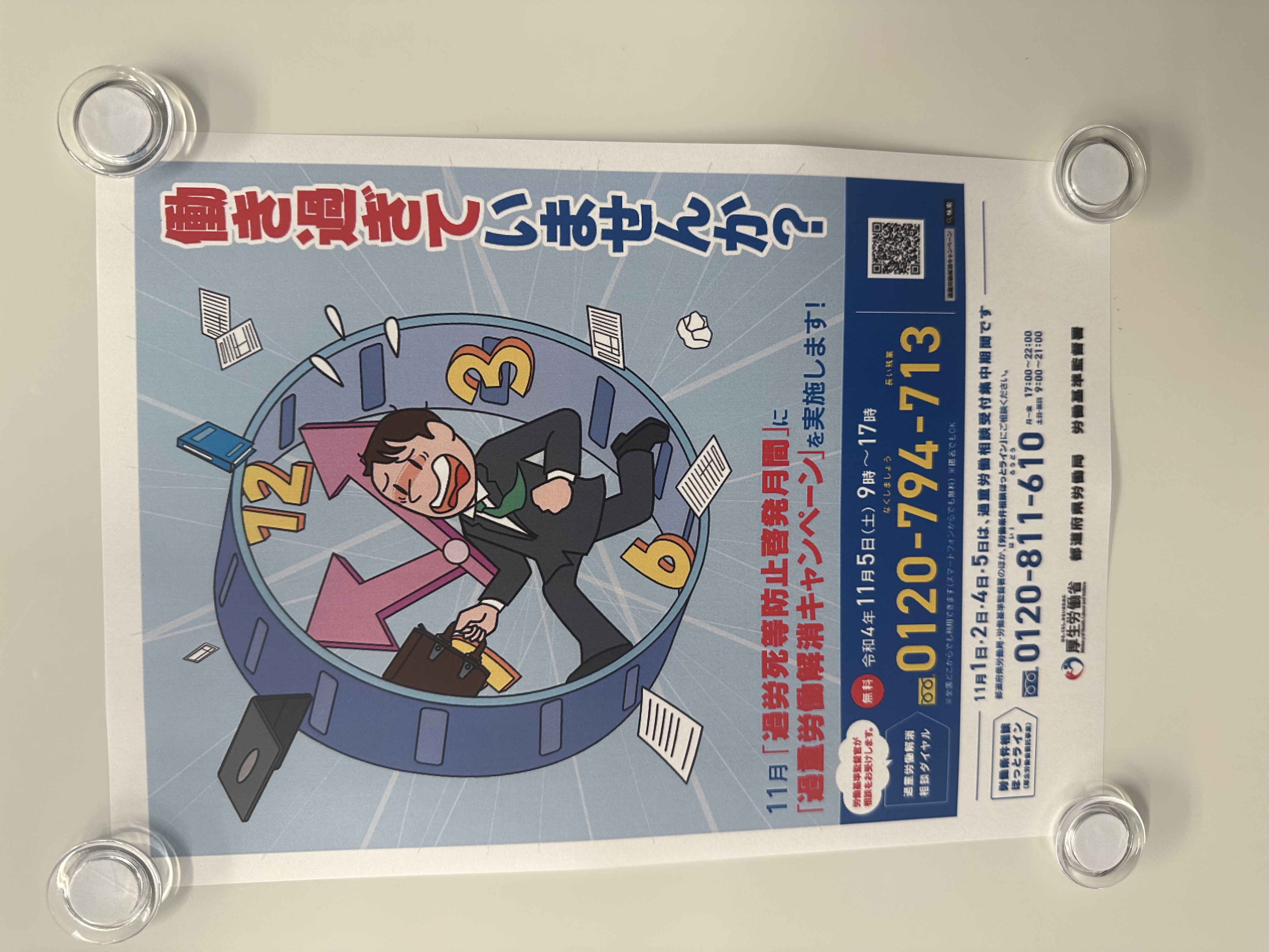 2022.11.01 過労死等防止啓発月間 11月は「過労死等防止啓発月間」です。 斉藤総業では、2016年から働き方改革に取り組んできました。 社内にポスターを貼り、社員に配布しました。 引き続き、働く人の健康を守るよう続けていきます。
