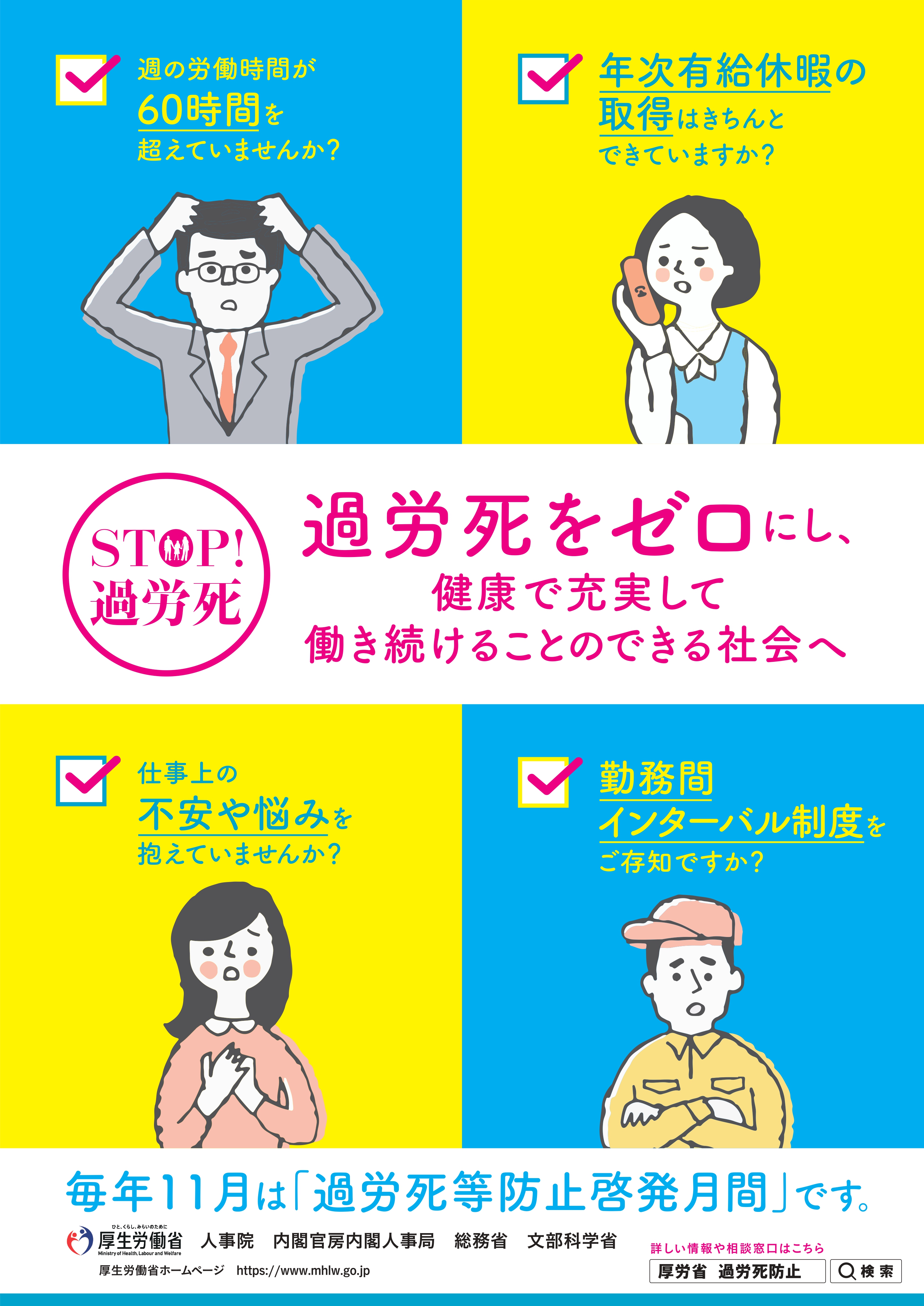 2023.11.01 11月は過労死等防止啓発月間 11月は過労死等防止啓発月間です。 斉藤総業では、2016年から取り組みをはじめ、 残業時間の削減、月に1回の有給休暇の取得に取り組んでいます。 適正な働き方で社員が健康で充実して働き続けることのできる 会社作りを目指していきます。