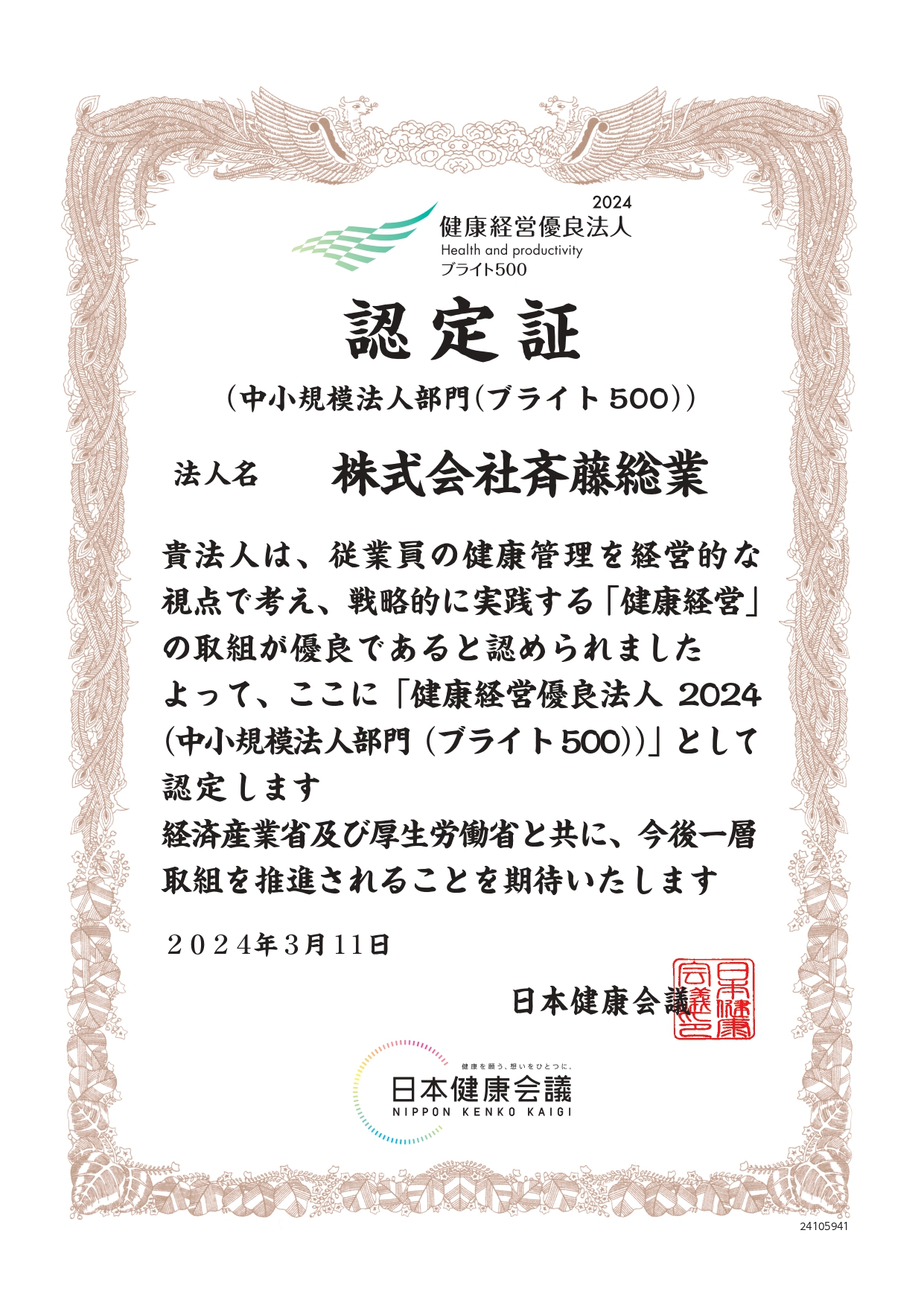 2024.03.12 健康経営優良法人2024【ブライト500】に認定されました 経済産業省および日本健康会議が選定する 「健康経営優良法人2024」(中小規模法人部門)に認定されました。 2020年から5年連続で認定を受け、 2年連続で、中小規模法人部門の上位500社である「ブライト500」に選ばれることが出来ました。 これまで社員一人ひとりの心と身体の健康を目標に職場環境の改善や社内制度の見直しを進めてまいりました。 「ブライト500」の認定をうけ、より一層、社員の心と身体の健康維持・増進、働きやすい環境づくりのために、新たな取り組みを積極的に取り入れてまいります。