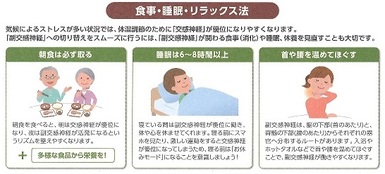 気候によるストレスが多い状況では、体温調節のために 「交感神経」が優位になりやすくなります。 「副交感神経」への切り替えをスムーズに行うには、「副交感神経」が関わる食事(消化)や睡眠、休養を見直すことの大切です。
